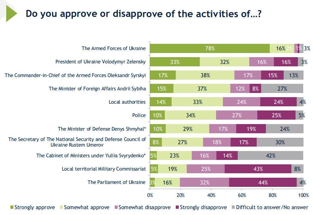 Президенту Украины Владимиру Зеленскому полностью или частично доверяют 65%, главнокомандующему ВСУ Александру Сырскому – 55%. Чуть меньше (52%) уровень поддержки у министра иностранных дел Андрея Сибиги.