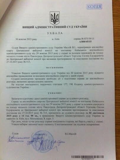 Иск к Центризбиркому кандидата в мэры Павлограда от партии УКРОП Евгения Терехова Киевский апелляционный административный суд удовлетворил в полном объеме 29 октября.