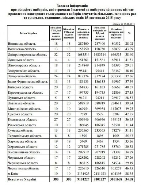 По официальным данным Центральной избирательной комиссии, в повторном голосовании на выборах городских голов 15 ноября приняли участие 34,08% избирателей. Об этом говорится в сообщении ЦИК.Активнее всех избиратели осуществляли волеизъявление в Тернопольской области (55,67%) – это единственная область, где проголосовали более половины избирателей. Второе место у Черниговской области – 46,45%, третье у Волынской – 43,39%.Самая низкая явка зафиксирована в Херсонской области – 20,52%. Явка на выборах мэра в Киеве составила 28,35% избирателей.