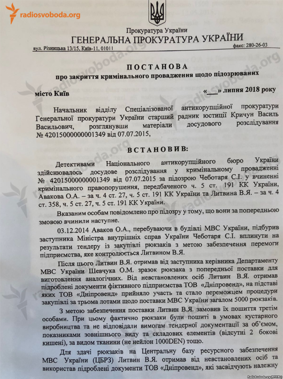 Специализированная антикоррупционная прокуратура (САП) закрыла уголовное производство в отношении сына главы МВД Арсена Авакова Александра и бывшего замглавы МВД Сергея Чеботаря по делу о закупке рюкзаков для Нацгвардии из-за отсутствия "прямых достаточных доказательств". Копию постановления САП 12 июля опубликовало "Радіо Свобода".