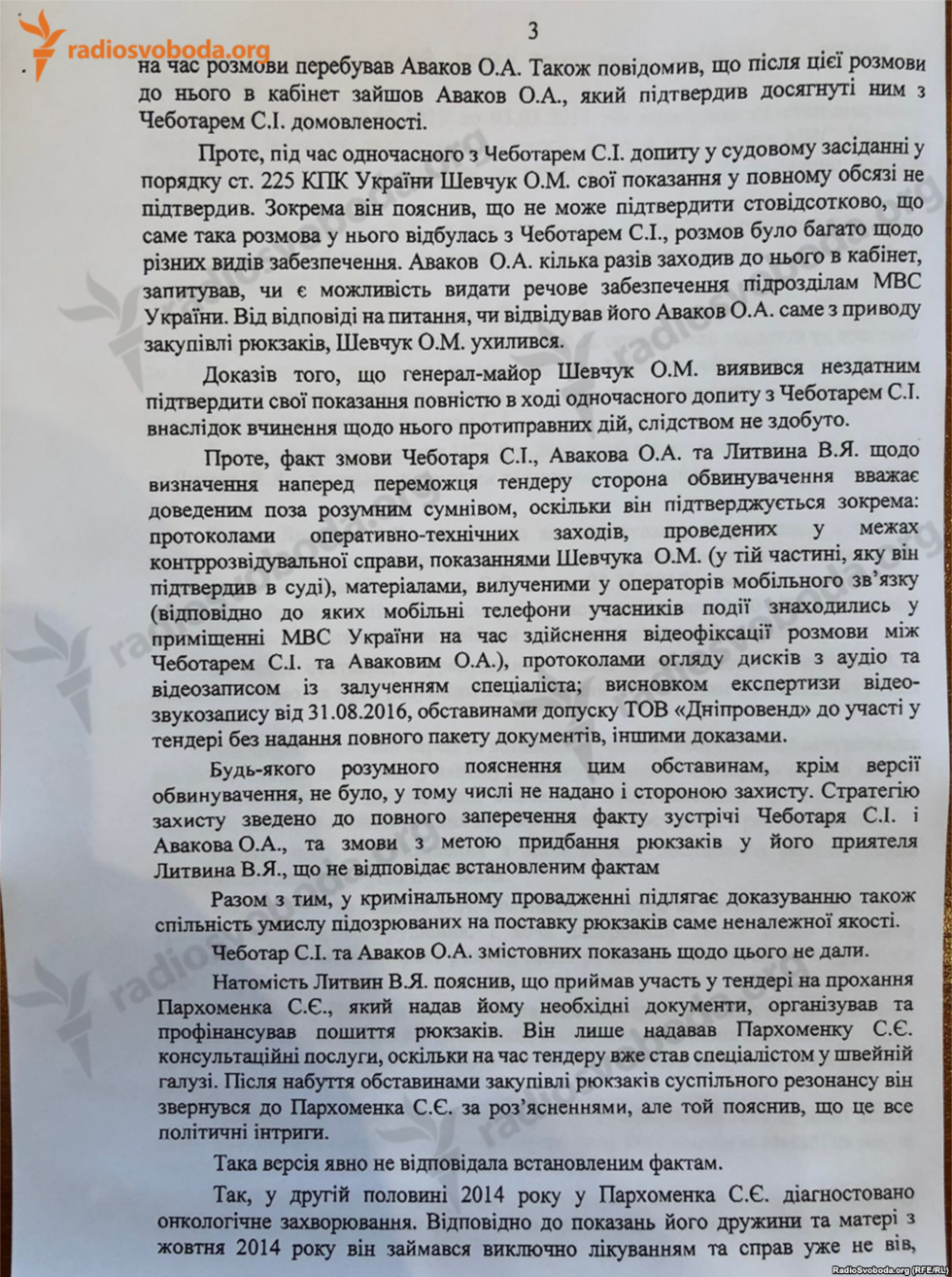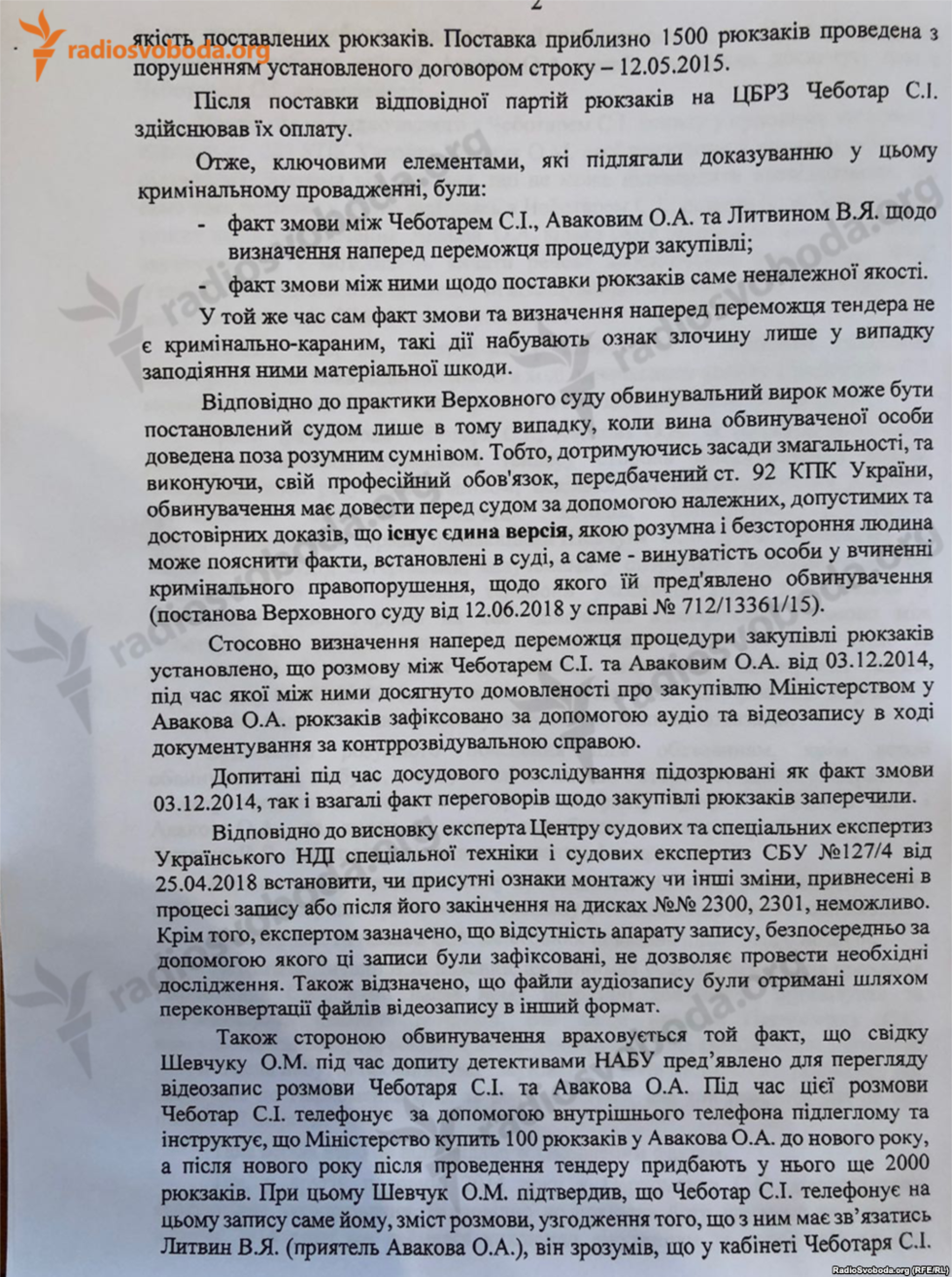 Согласно документу, следователи не смогли доказать, что подозреваемые были знакомы с планом поставки "именно некачественных рюкзаков". Всю вину на себя взял Владимир Литвин – представитель фирмы – победителя тендера на поставку рюкзаков.