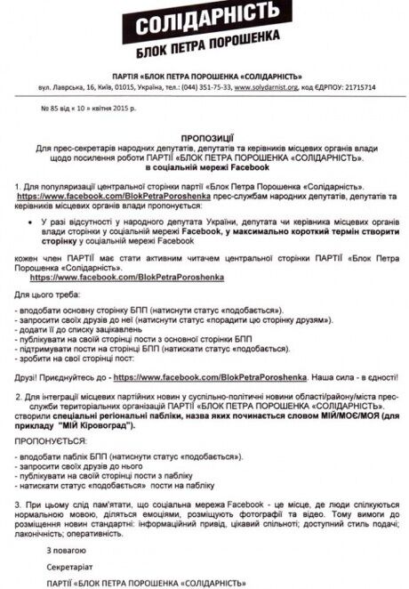 По информации издания, секретариат БПП разослал такое предложение пресс-секретарям народных депутатов. В нем депутатам предлагается стать активными читателями страницы БПП в социальной сети и рассказывать о ней друзьям, "лайкать" новости.