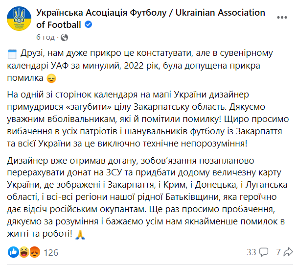 "Оказывается, весь прошлый год УАФ продавала календарь, причем особый (к 30-летию организации), с изображением карты Украины без Закарпатской области. [...] Карта изображена в конце календаря, на 2023 году", – говорится в сообщении.
