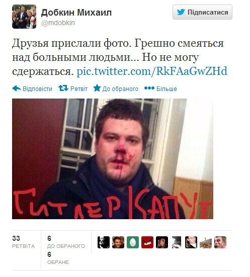 "Друзья прислали фото. Грешно смеяться над больными людьми ... Но не могу сдержаться", – прокомментировал он снимок побитого Ильенко с подписью "Гитлер капут".