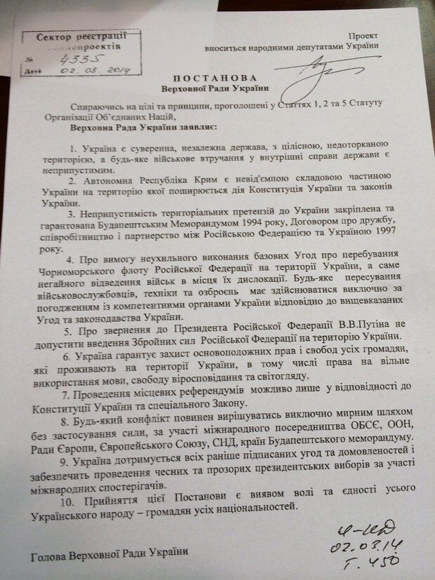 Документ: Верховная Рада требует от Путина не вводить войска в Украину