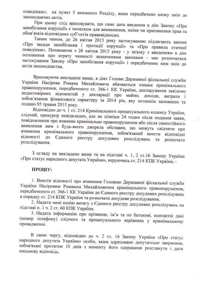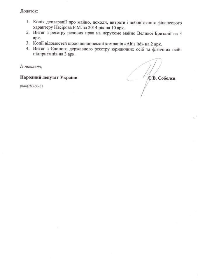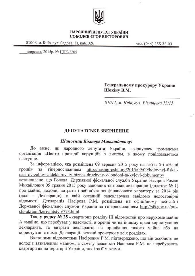 К генеральному прокурору Украины обратился нардеп, глава парламентского Комитета по борьбе с коррупцией Егор Соболев с просьбой проверить, действительно ли глава Государственной фискальной службы Роман Насиров задекларировал заведомо неправомерные данные.