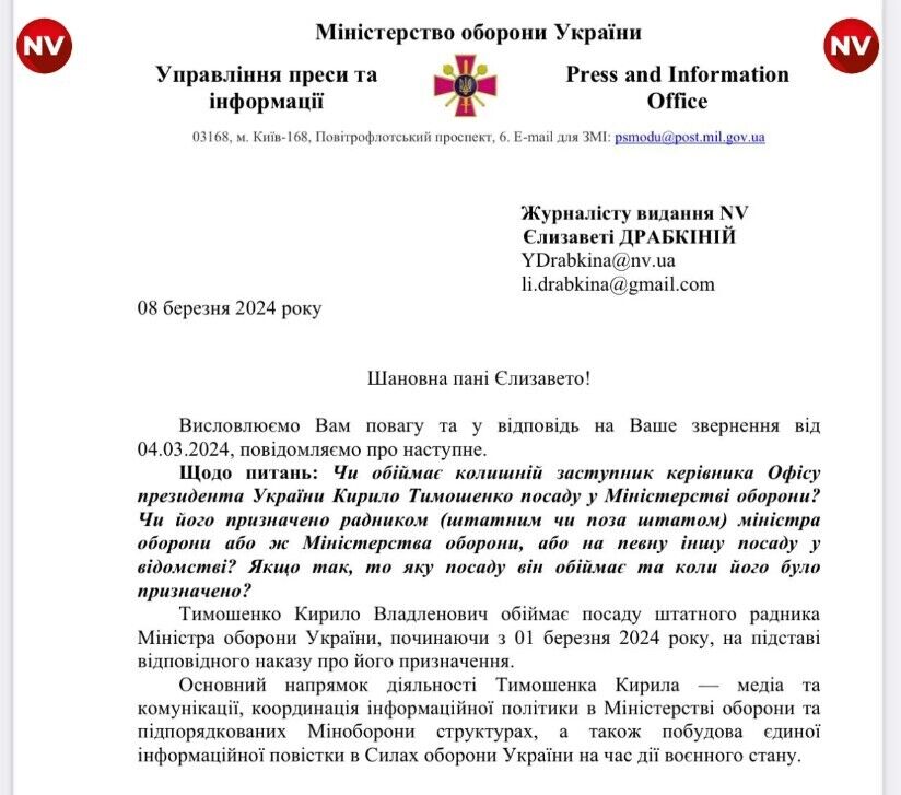 В пресс-службе Минобороны на соответствующий запрос NV сообщили, что Тимошенко с 1 марта 2024 года занимает должность штатного советника министра обороны – на основании соответствующего приказа о его назначении.