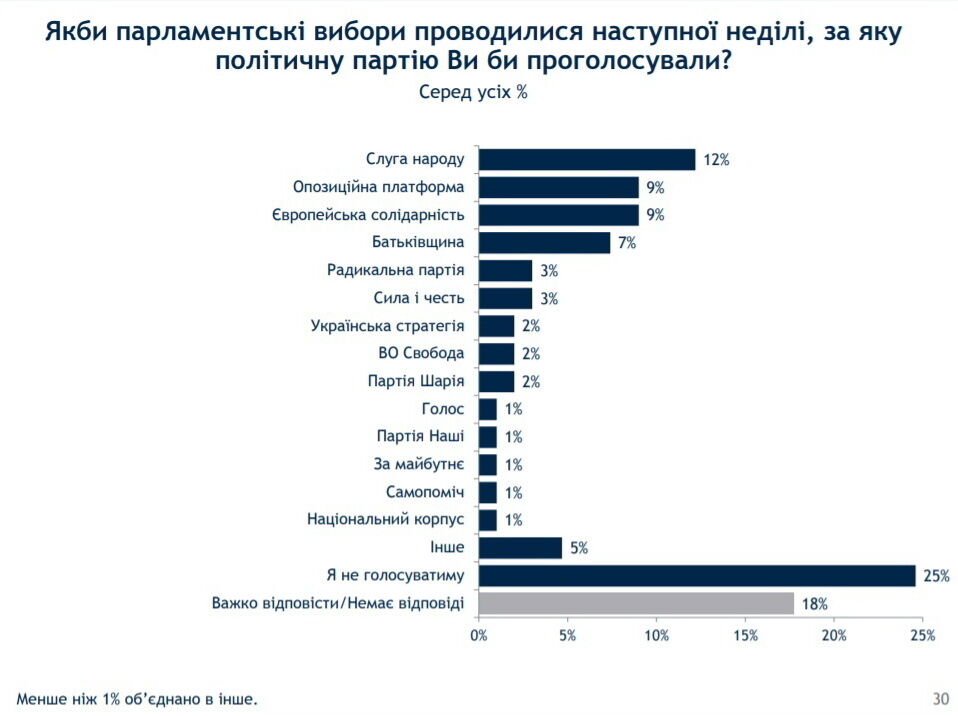 Согласно исследованию, 25% украинцев не пошли бы на выборы, если бы их проводили в ближайшее воскресенье, еще 18% опрошенных не смогли определиться, за кого хотели бы проголосовать.
