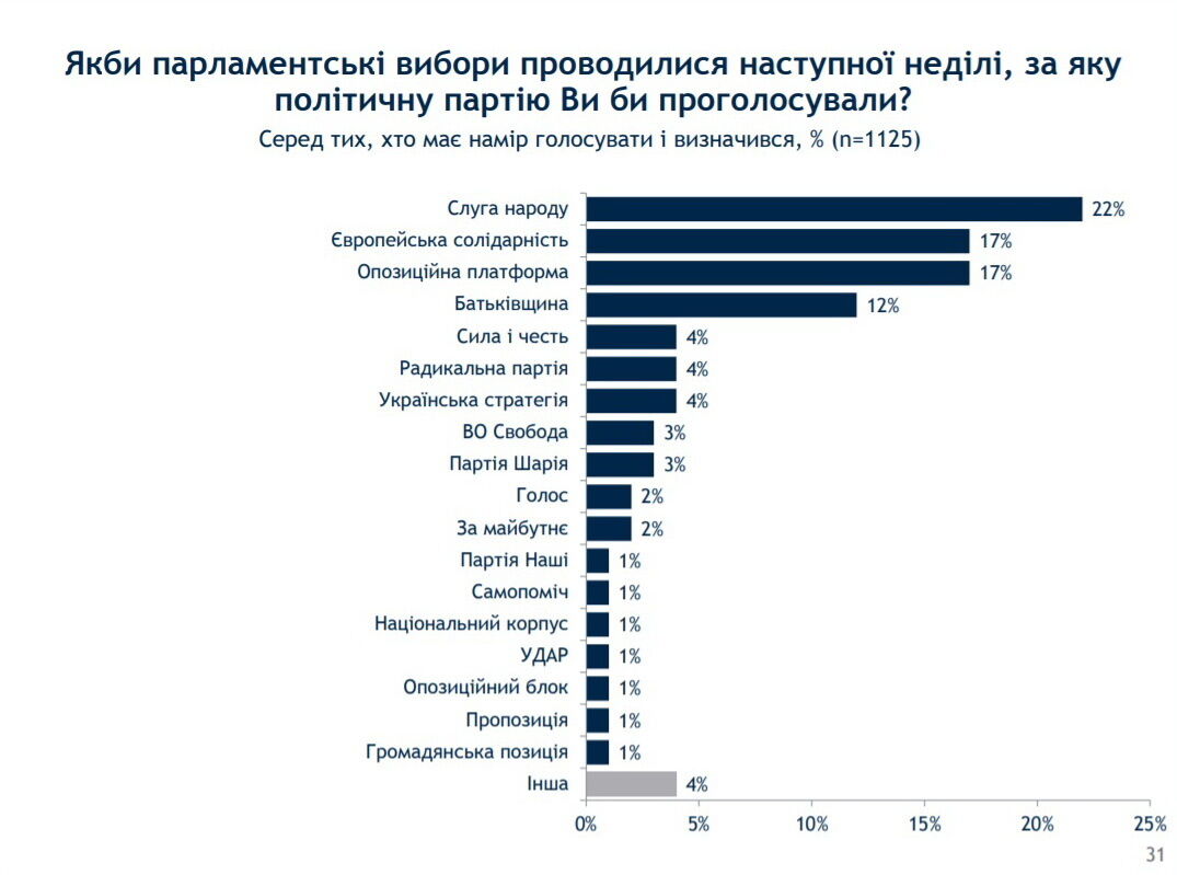 Далее в рейтинге – "Европейская солидарность" и "Оппозиционная платформа – За жизнь", политсилы имеют одинаковый уровень поддержки – по 17%. На четвертом месте – "Батьківщина" (12%).