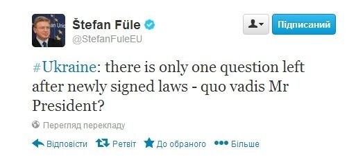 После подписания Президентом Украины Виктором Януковичем скандальных законов, принятых Верховной Радой 16 января, еврокомиссар Штефан Фюле спросил у главы государства, "куда он идет?".