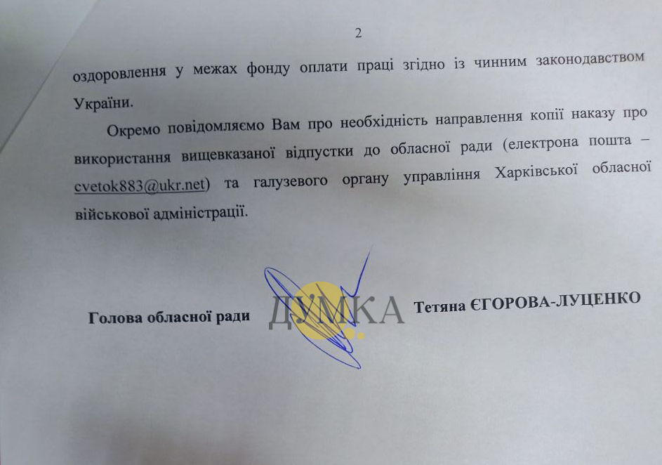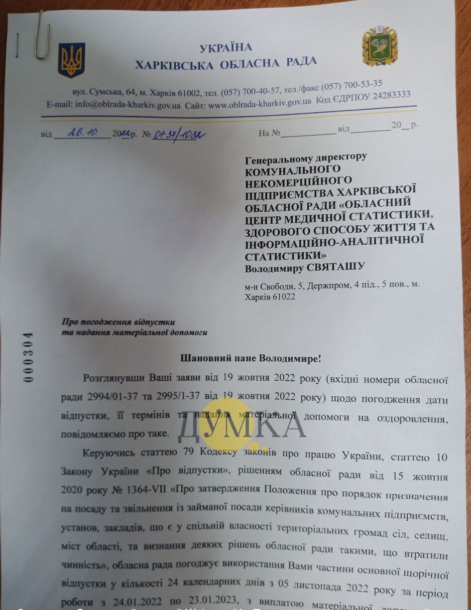 Согласно документу, 19 октября Святаш письменно обратился к Егоровой-Луценко с заявлением о согласовании даты отпуска, его сроков и предоставлении материальной помощи на оздоровление. 26 октября глава Харьковского облсовета согласовала депутату отпуск продолжительностью 24 календарных дня, начиная с 5 ноября 2022 года, "с выплатой материальной помощи на оздоровление".