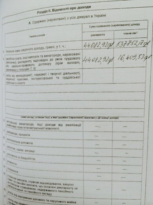 Члены его семьи получили за год 537 752 гривен, из которых 16 409 гривен – заработная плата.