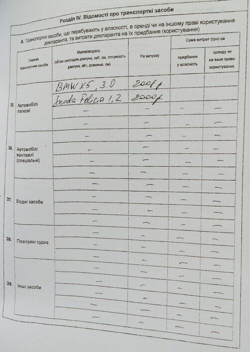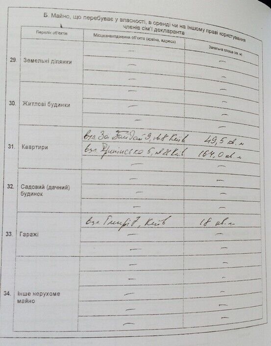У министра есть две квартиры в Киеве (площадью 49,5 кв. м и 164 кв. м), гараж (18 кв. м) и два автомобиля: ВМW Х5 2008 года выпуска и Skoda Felicia 2000 года выпуска.