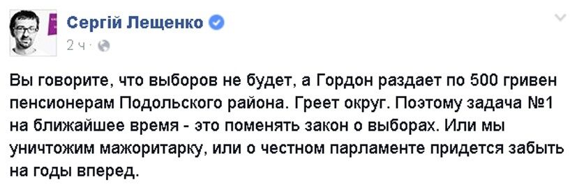На своей странице в Facebook Сергей Лещенко написал, что Дмитрий Гордон "раздает по 500 гривен пенсионерам", намекнув, что таким образом депутат Киевсовета готовится к возможным перевыборам в парламент.