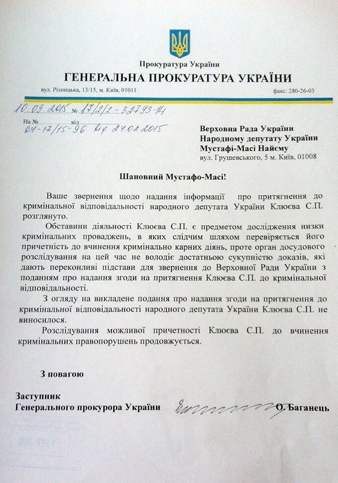 Генеральная прокуратура Украины (ГПУ) проверяет деятельность внефракционного народного депутата Сергея Клюева в рамках нескольких уголовных производств, однако пока не имеет достаточных оснований для внесения в парламент представления о снятии с него депутатской неприкосновенности. Об этом говорится в ответе ГПУ на запрос народного депутата от Блока Петра Порошенко Мустафы Найема, который он опубликовал на своей странице в Facebook.