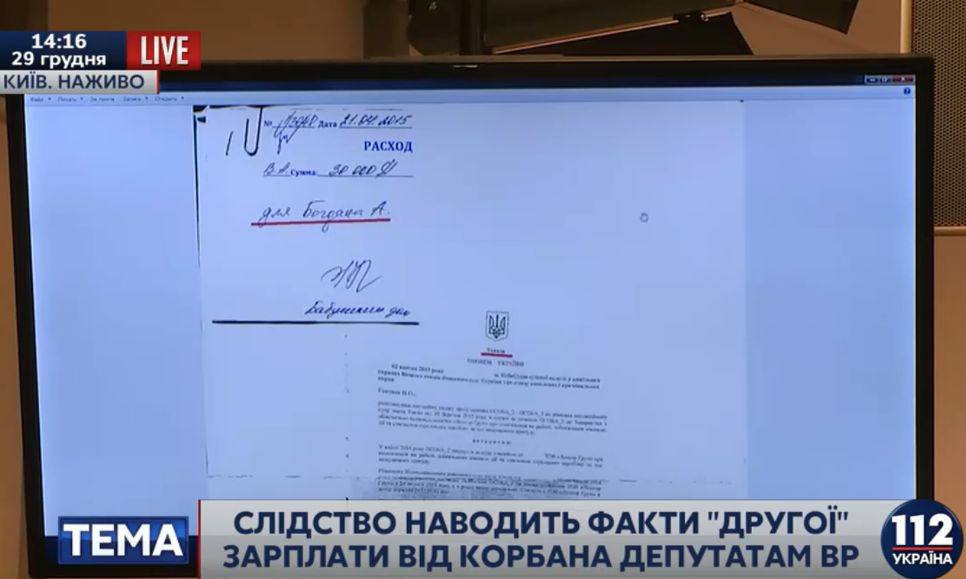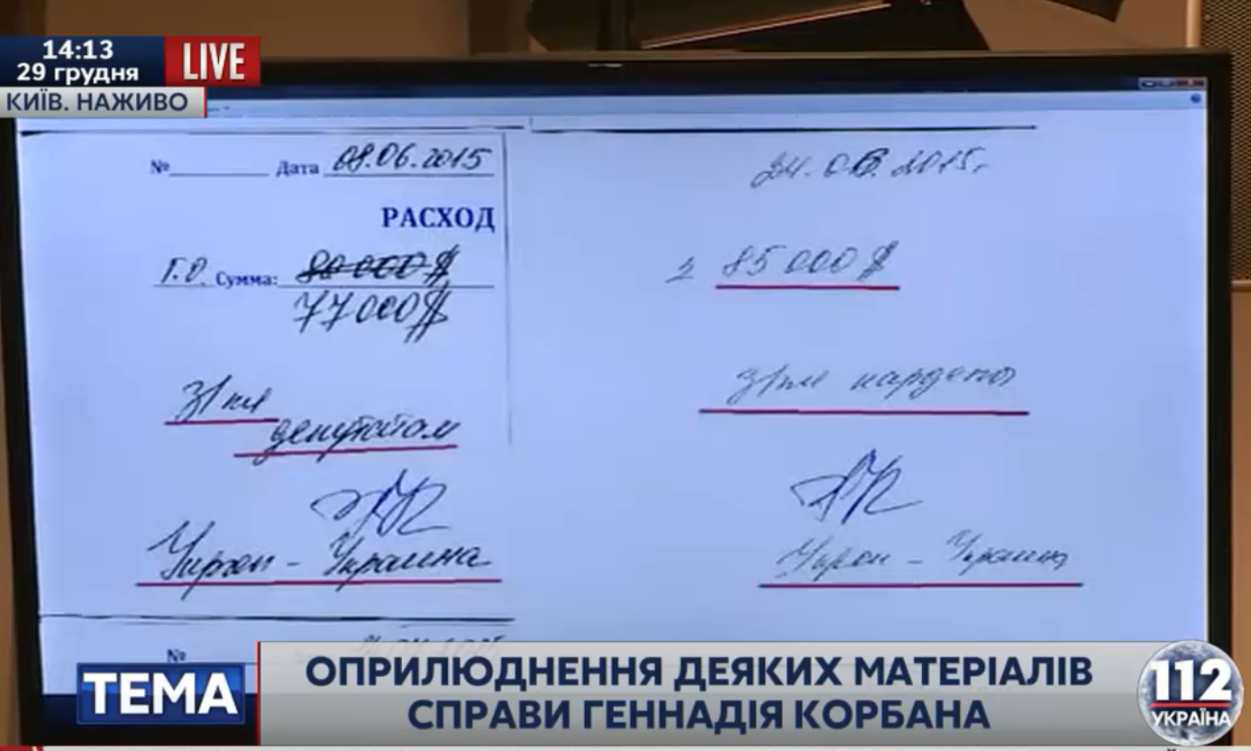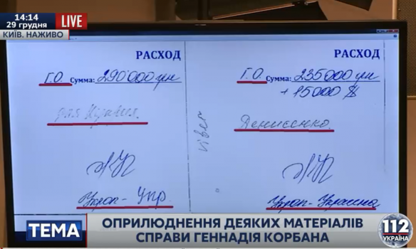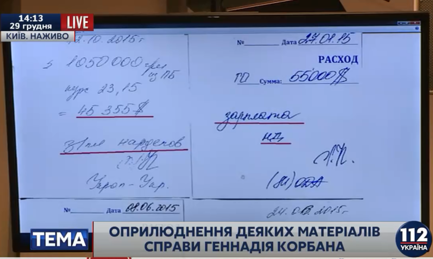 "Вот первый слайд, это небольшого формата бумажки, на которых написана дата, номер, слово "расход", указываются суммы, суммы значительные, суммы где-то в гривнах, где-то в долларах США. Например, верхний первый, 1,05 млн грн, курс 23,15. Итого $45,355 тыс. – "зарплата нардепов "УКРОП-Украина". Следующая бумажка, или расписка, с подписью – $55 тыс., написано "ОГА", – прокомментировал прокурор ГПУ Валерий Карпунцов.