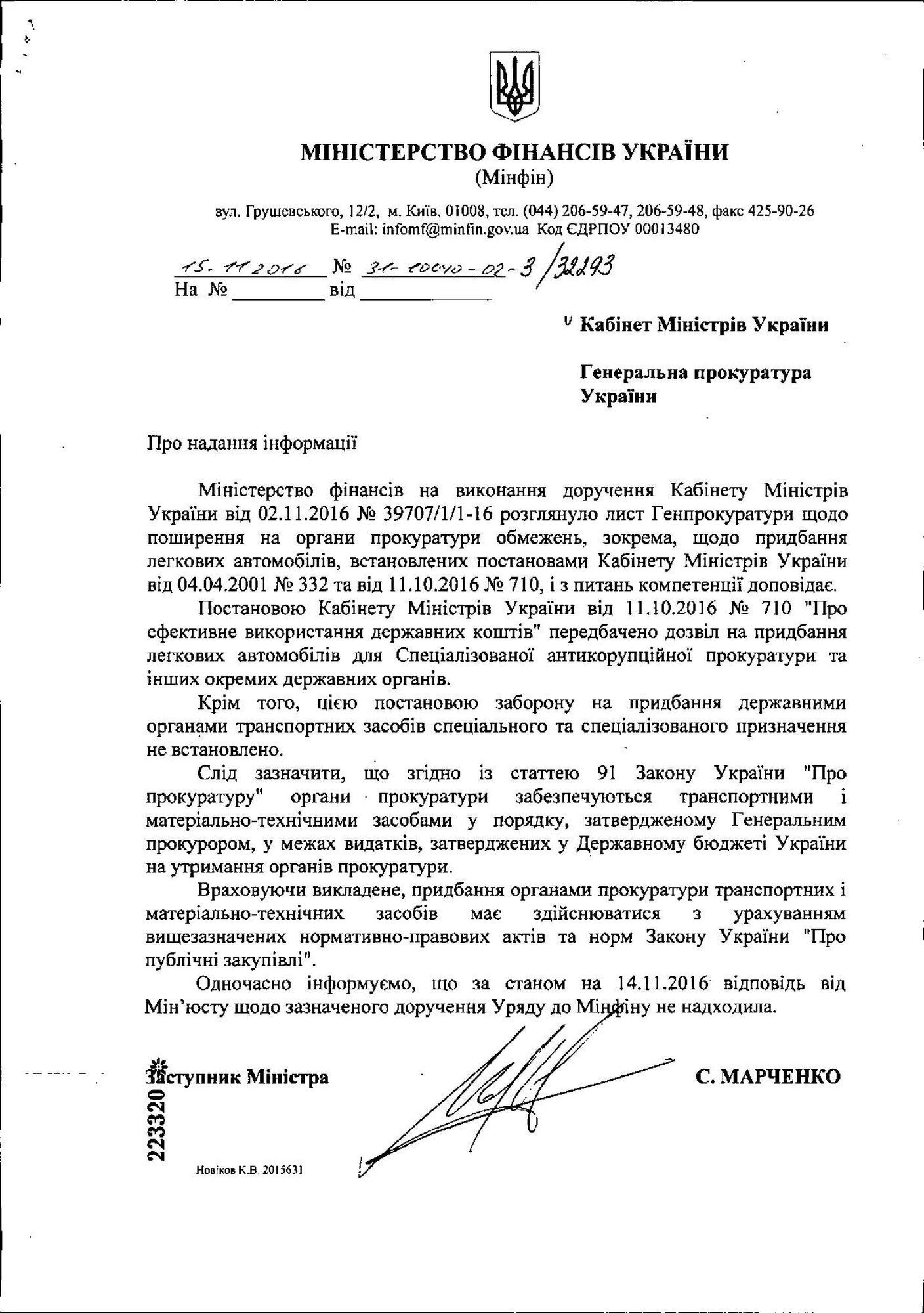 ГПУ ссылается на письмо Министерства финансов от 15 ноября 2016 года, которое также есть в распоряжении журналистов. В нем прокуратура просит разъяснить, распространяются ли на нее ограничения постановления. Однако в ответе Минфина не говорится, что ГПУ не должна учитывать правительственное постановление.
