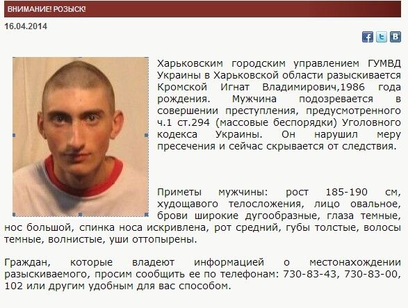 Участник киевского и харьковского Антимайдана Игнат Кромской, известный по прозвищу Топаз, объявлен в розыск, сообщается на сайте харьковской милиции.