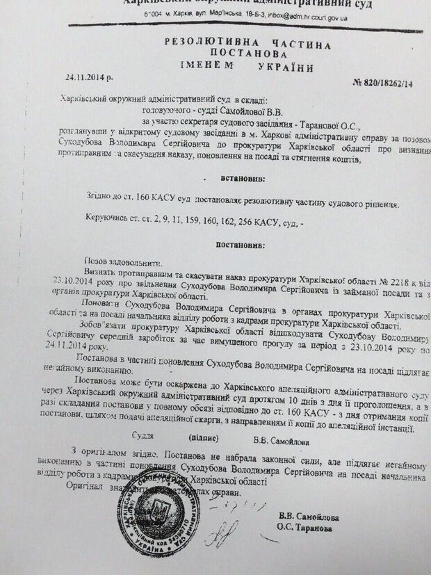 "Восстановить Суходубова Владимира Сергеевича в органах прокуратуры Харьковской области и на должности начальника отдела работы с кадрами прокуратуры Харьковской области", – сказано в постановлении суда.