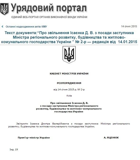 "Освободить Исаенко Дмитрия Валерьевича с должности заместителя министра регионального развития, строительства и жилищно-коммунального хозяйства Украины", – сказано в распоряжении №2-р от 14 января 2015 года.