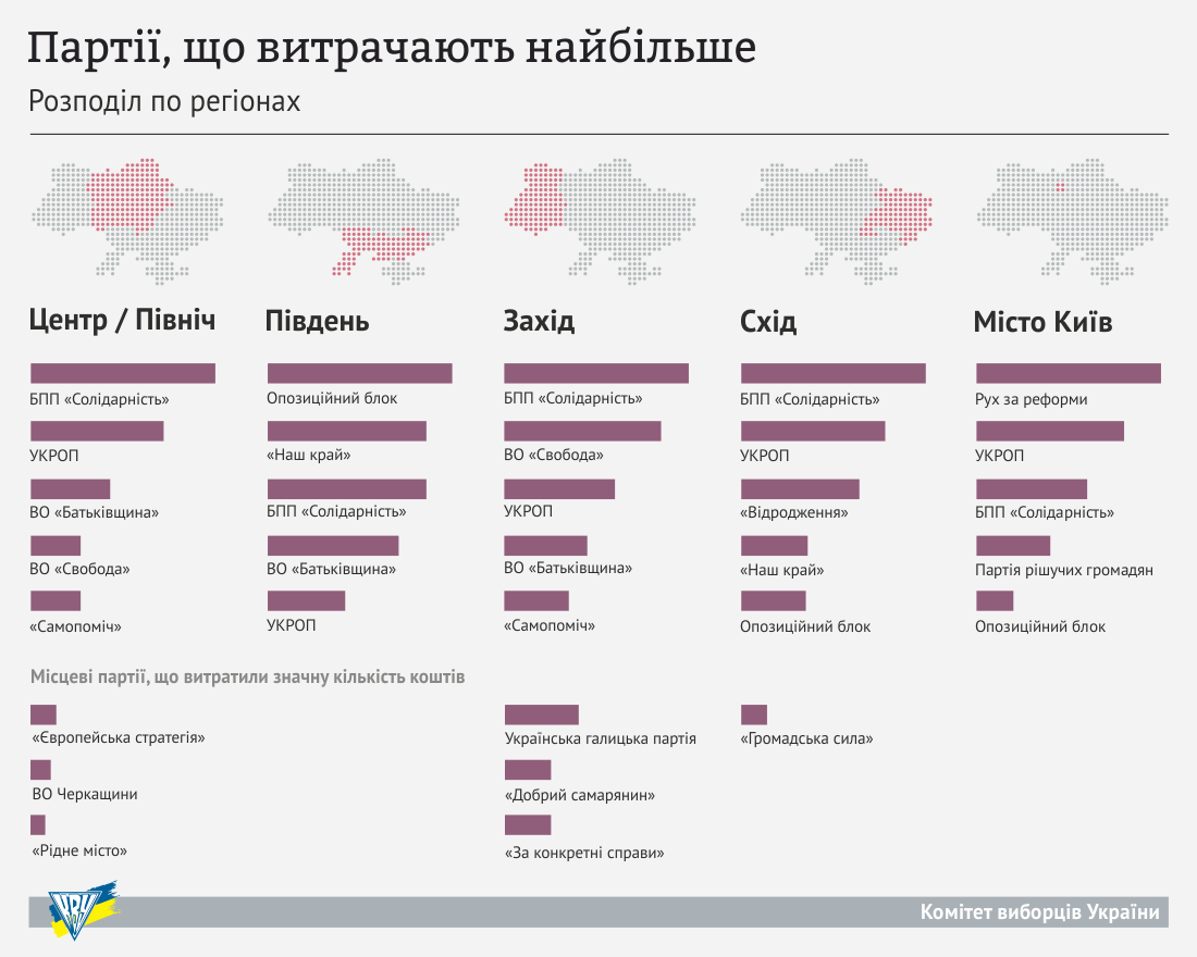 Экспертная оценка основана на количестве билбордов, сити-лайтов, печатных материалов, агитационных палаток, сувенирной продукции, публичных мероприятий, организованных в поддержку политической силы.Исследование показало, что расходы партий в разных регионах Украины отличаются. Так, в южных областях Украины (Запорожская, Одесская, Херсонская, Николаевская) наиболее заметна кампания партий Оппозиционный блок и "Наш Край". На востоке Украины (Днепропетровская, Донецкая, Луганская, Харьковская области) партии "Возрождение", "Наш край" и Оппозиционный блок суммарно потратили за отчетный период вдвое больше, чем другие. На западе (Ивано-Франковская, Закарпатская, Ровенская, Львовская, Черновицкая, Тернопольская, Волынская, Хмельницкая области) лидерами по расходам стали партия Блок Петра Порошенко "Солидарность" и ВО "Свобода". В центре и на севере страны (Винницкая, Черкасская, Полтавская, Кировоградская, Киевская, Житомирская, Сумская и Черниговская области) самые большие расходы у БПП "Солидарность" и партии УКРОП.