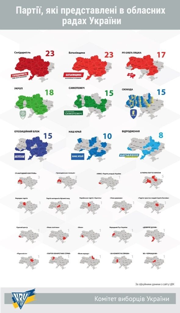 Комитет избирателей Украины проанализировал результаты местных выборов и опубликовал результаты анализа по состоянию на 11 ноября. Как отмечается, Блок Петра Порошенко "Солидарность", ВО "Батьківщина" и "Наш край" являются лидерами по количеству избранных депутатов по результатам выборов в местные советы. Наибольшее количество депутатов – 8 417 были избраны от БПП "Солидарность". "Батьківщину" в местных советах будут представлять 7653 депутата. В тройке лидеров – партия "Наш край". В местные советы от этой политической силы прошли 4 397 депутатов. Также в пятерку лидеров вошли Оппозиционный блок (3843 депутата) и Радикальная партия Ляшко (2351 депутат).Представительство в 23 областных советах по результатам местных выборов-2015 получили БПП "Солидарность" и ВО "Батьківщина" – 22 областных и Киевский городской совет. УКРОП и Радикальная партия Ляшко присутствуют соответственно в 18 и 17 областных советах. В 15 областных советов избраны представители Оппозиционного блока, "Самопомочі" и ВО "Свобода". Представительство в 10 областных советах есть у партии "Наш край". В восемь областных советов вошли депутаты от партии "Відродження".