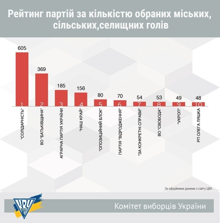 Согласно данным ЦИК, наибольшее количество сельских поселковых и городских председателей избрали от БПП "Солидарность" – 605 человек. Вторую позицию заняла ВО "Батьківщина" – 369 человек. Аграрная партия Украины по количеству сельских поселковых и городских голов заняла третье место – 185 человек. Партия "Наш край" заняла четвертое место из 156 представителей на должностях председателей городов, сел и поселков. Следующими идут Оппозиционный блок (80 человек), "Відродження" (70 человек), "За конкретные дела" (54 человека), ВО "Свобода" (53 человека), Радикальная партия Олега Ляшко (48 человек).