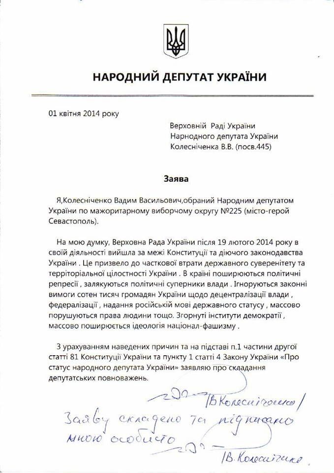 "Подал официальное заявление о сложении депутатского мандата прекратившего свое реальное существование украинского парламента. Считаю, что в это рубежное время каждый должен выбрать, на какой он стороне: веры, правды и совести или должностей и денег. Уверен, что Победа будет за нами! За нами правда и великая история, честь и вера", – заявил Колесниченко.