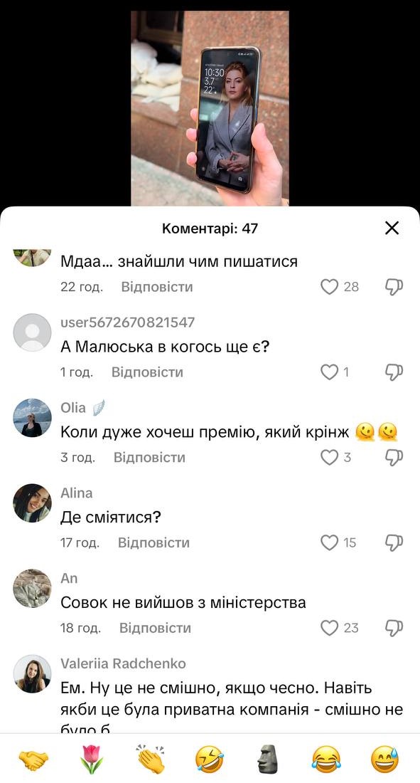 "Как вы могли понять, у Минюста появился ТікТок, и там уже много полезной информации, кроме кринж-видео о фотках на заставке", – отметила чиновница.