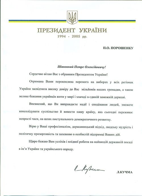 "Полученная вами убедительная победа на выборах во всех регионах Украины подтвердила высокое доверие к вам миллионов наших граждан, а также большое желание украинцев жить в мире и согласии в едином процветающем государстве", – заявил Кучма.