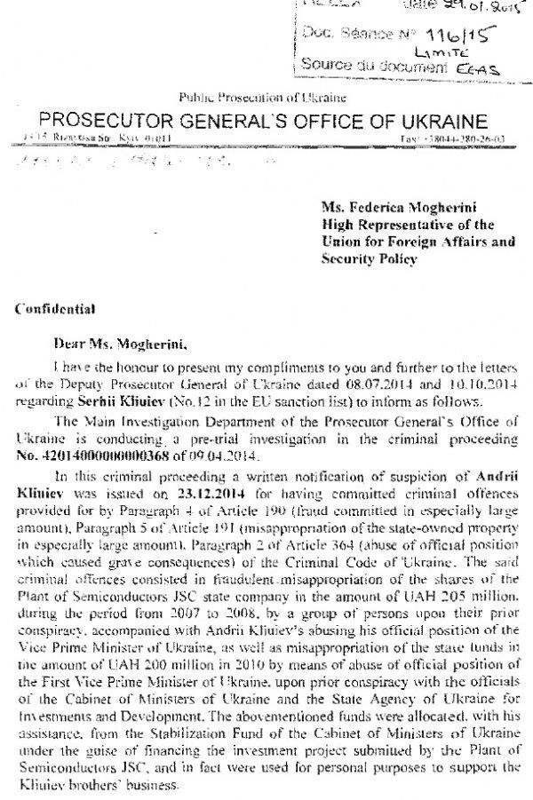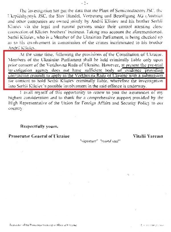 29 января 2015 года тогдашний генпрокурор Виталий Ярема написал верховному представителю ЕС по иностранным делам и политике безопасности Федерике Могерини письмо о том, что у украинского следствия нет доказательств, чтобы предъявить обвинение народному депутату Сергею Клюеву в совершении преступлений.