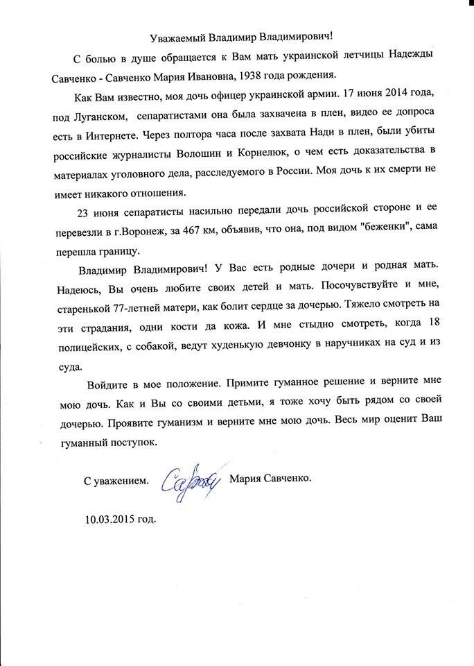 "Владимир Владимирович! У вас есть родные дочери и родная мать. Надеюсь, вы очень любите своих детей и мать. Посочувствуйте и мне, старенькой 77-летней матери, у которой болит сердце за дочь. <...> Проявите гуманизм и верните мне дочь", – написала Мария Савченко.