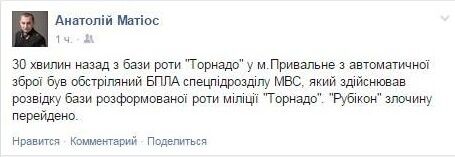 "30 минут назад с базы роты "Торнадо" в Привальном из автоматического оружия был обстрелян беспилотник спецподразделения МВД", – написал прокурор.