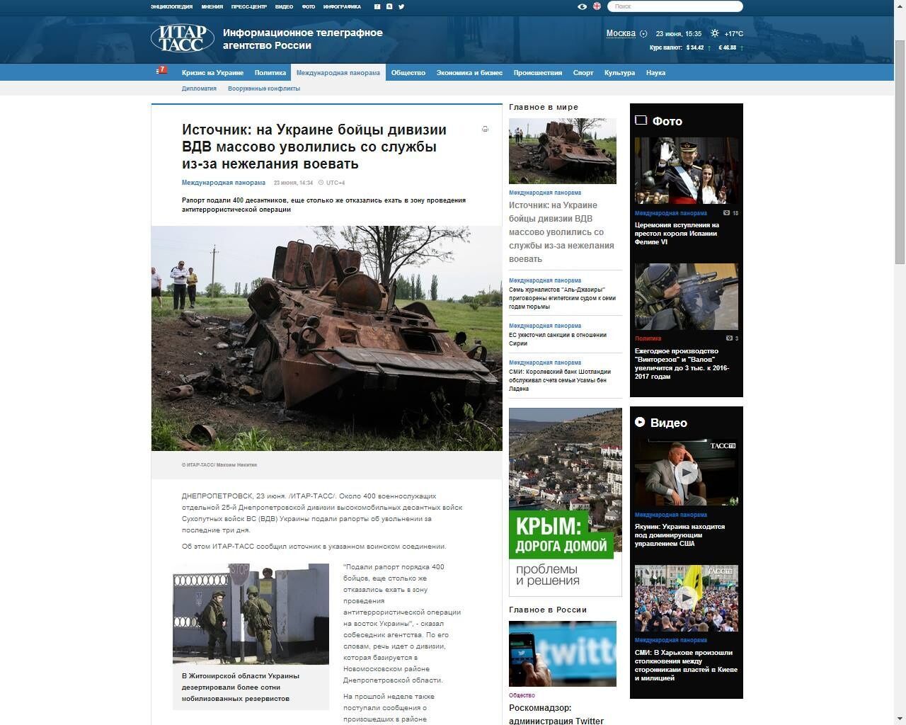 Информационное агентство ИТАР-ТАСС разместило на своем сайте неправдивую новость об увольнении 400 украинских десантников отдельной 25-й Днепропетровской дивизии высокомобильных десантных войск. Об этом сообщает пресс-служба Министерства обороны Украины.