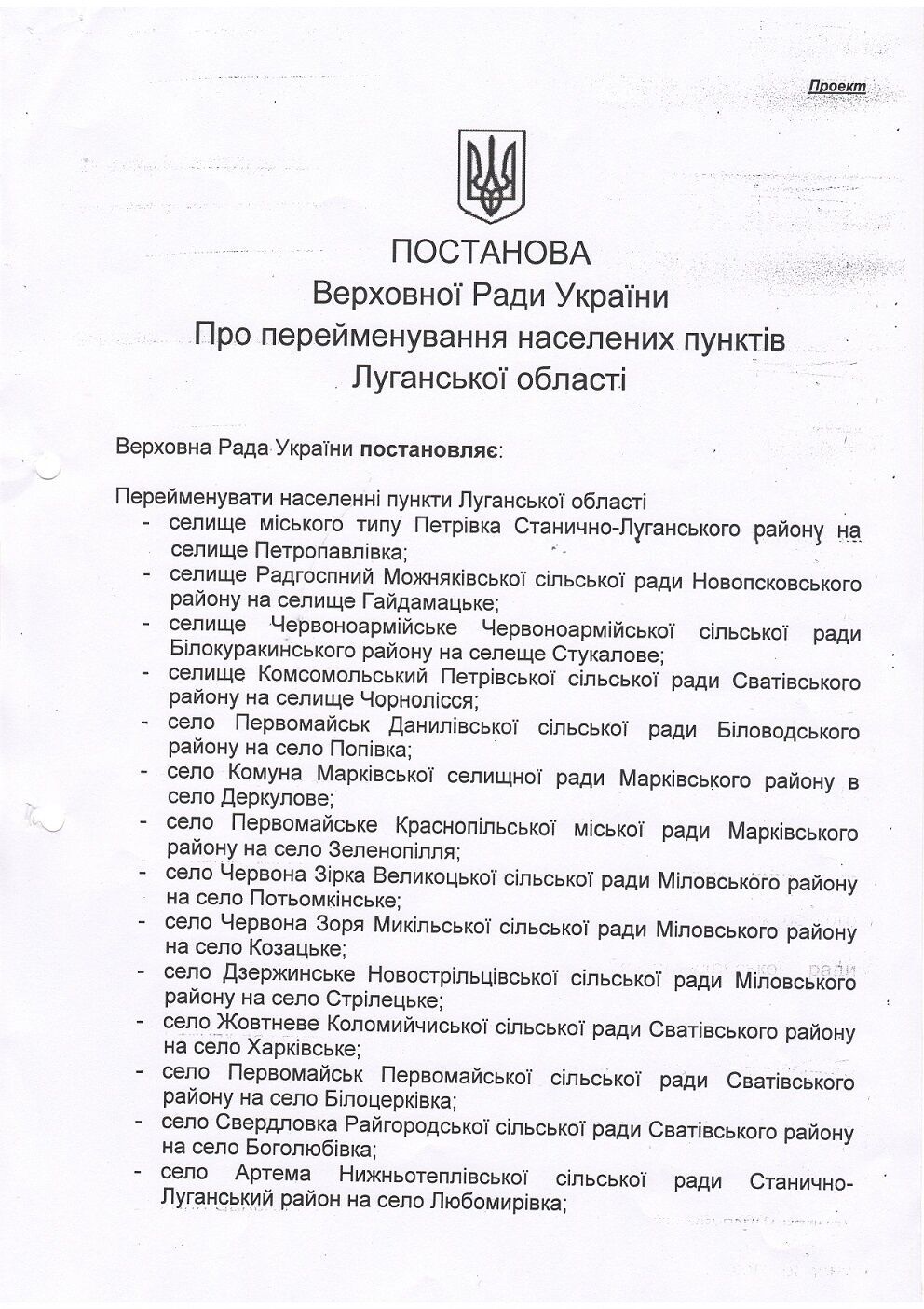 В мае комиссия провела исследовательскую работу и пришла к выводам, которые изложила в проекте постановления Верховной Рады о переименовании населенных пунктов Луганской области.