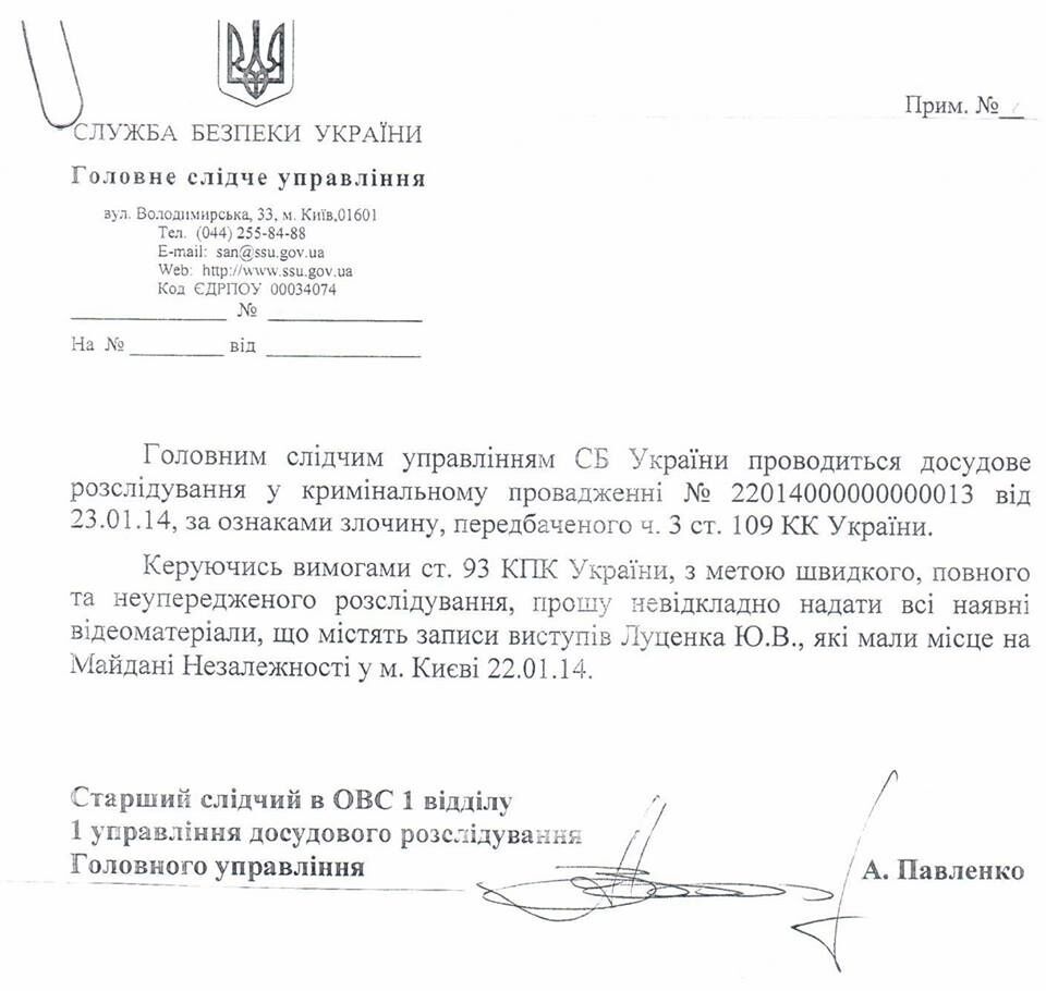СБУ обратилась к средствам массовой информации с требованием "немедленно предоставить все имеющиеся видеозаписи выступлений Юрия Луценко, которые имели место на Майдане Незалежности 22 января 2014 года". Соответствующий документ обнародовал в своем Facebook журналист Мустафа Найем.