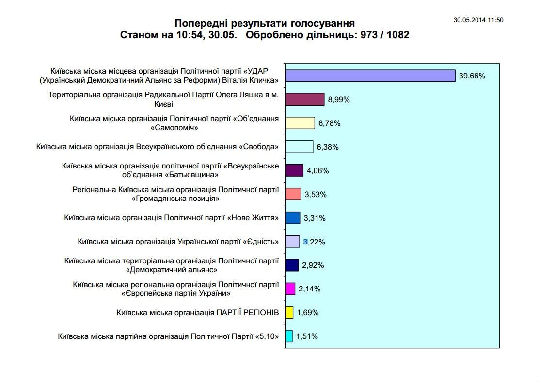Согласно данным 973 участков из 1082, трехпроцентный барьер преодолевают УДАР, "Радикальная партия", "Самопоміч", ВО "Свобода", "Батьківщина", "Гражданская позиция", "Новая жизнь" и "Єдність".