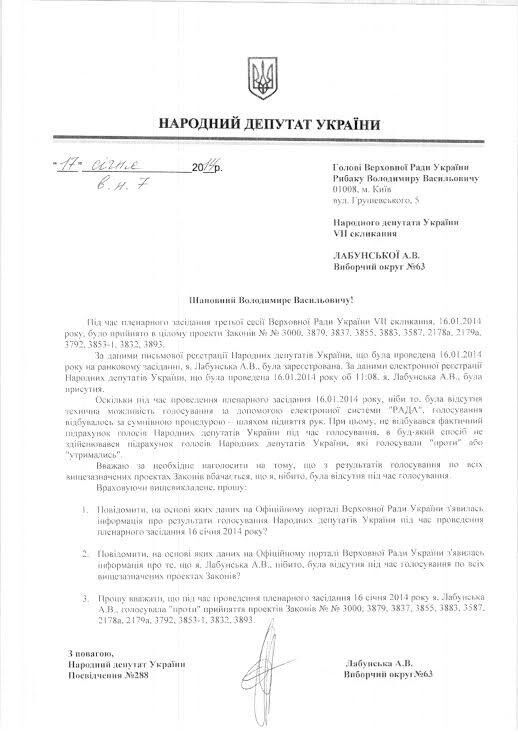 В депутатском обращении к главе Верховной Рады Владимиру Рыбаку депутат отметила, что 16 января во время голосования законопроектов в Верховной Раде не велся фактический подсчет голосов, поэтому его результаты не соответствуют действительности.