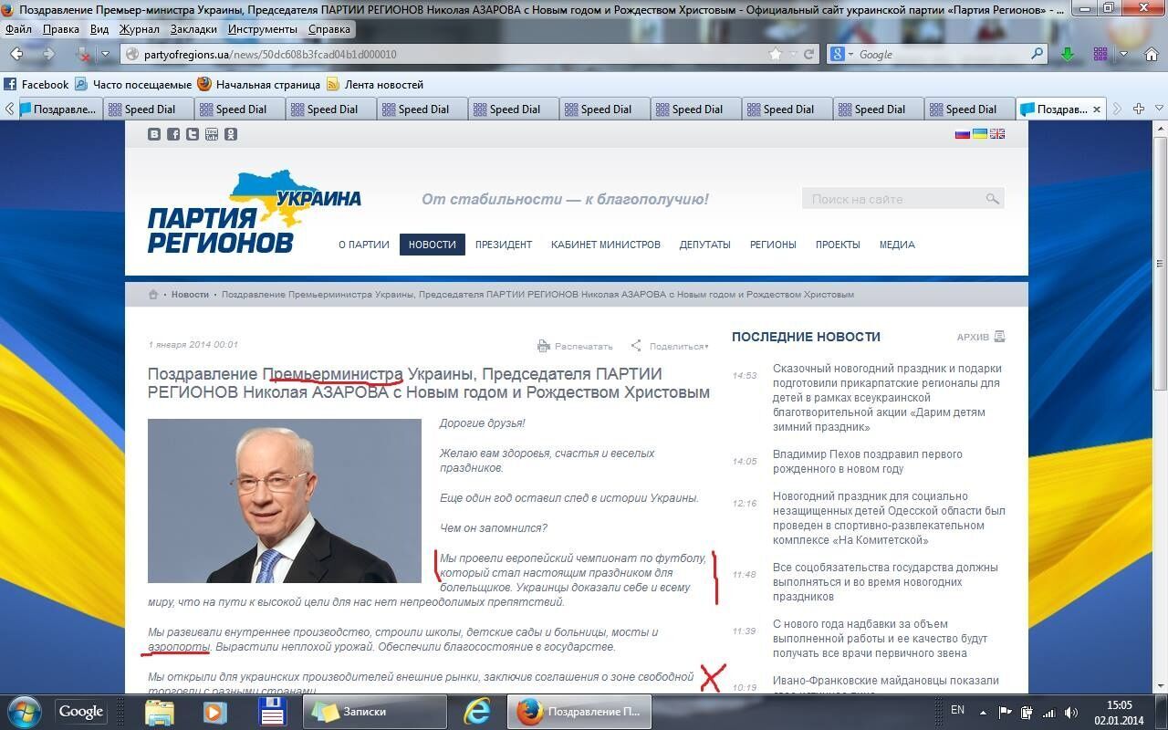 На официальном сайте Партии регионов было опубликовано прошлогоднее поздравление украинцев с Новым годом, подписанное премьер-министром Николаем Азаровым.
