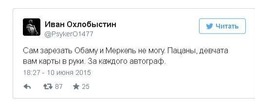 "Сам зарезать Обаму и Меркель не могу. Пацаны, девчата, вам карты в руки. За каждого – автограф", – написал Охлобыстин.
