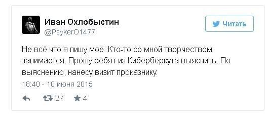 "Не все, что я пишу – мое. Кто-то со мной творчеством занимается. Прошу ребят из "Киберберкута" выяснить. По выяснению нанесу визит проказнику", – написал он.