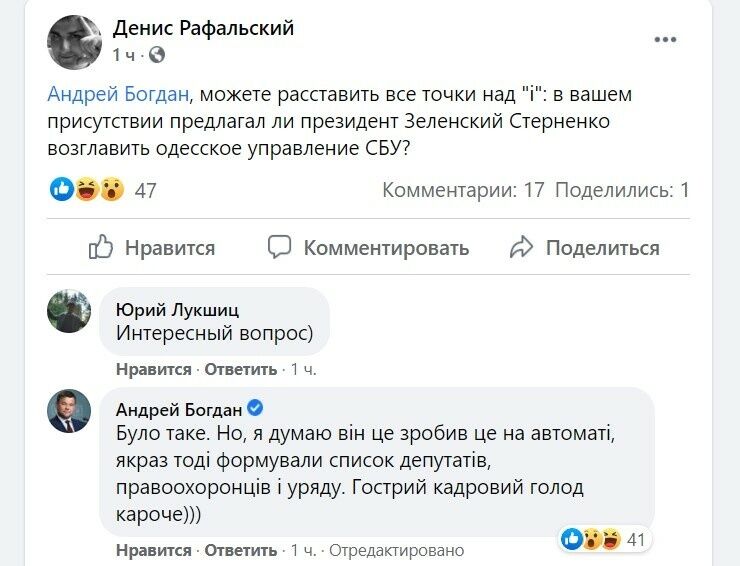 Бывший глава Офиса президента Андрей Богдан подтвердил, что президент Владимир Зеленский предлагал активисту Сергею Стерненко возглавить одесское управление Службы безопасности. Об этом он написал в комментарии к посту журналиста Дениса Рафальского в Facebook.