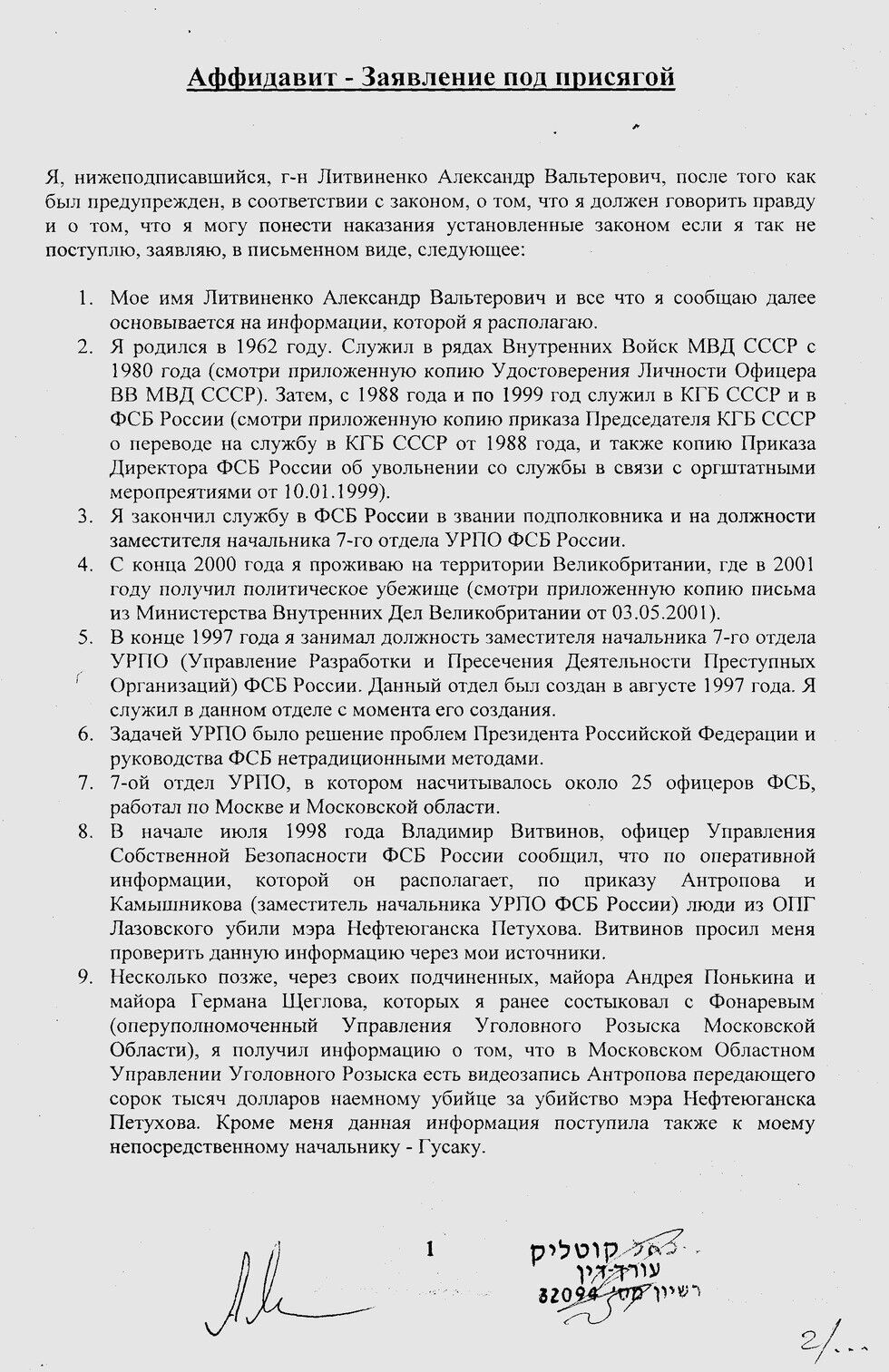 В показаниях Литвиненко сообщил, что в 1998 году ему поручили проверить причастность сотрудников российских спецслужб к убийству мэра Нефтеюганска Владимира Петухова.