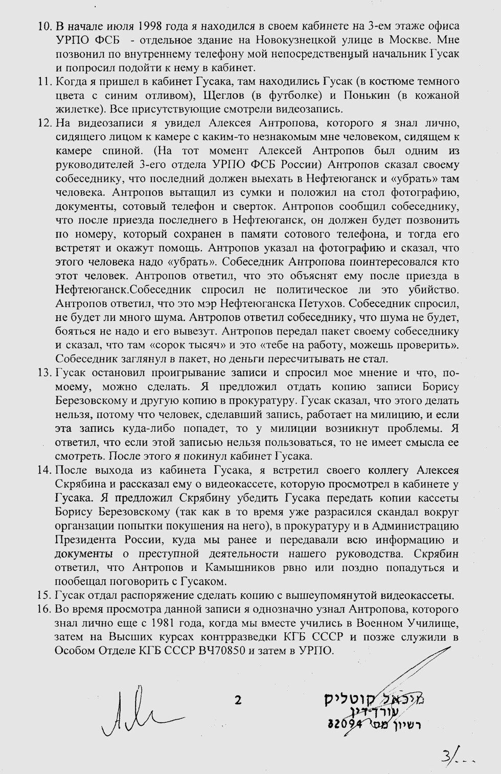 Позже, по его словам, удалось увидеть саму запись. "На видеозаписи я увидел Алексея Антропова, которого я знал лично, сидящего лицом к камере, с каким-то незнакомым мне человеком, сидящим к камере спиной. (На тот момент Алексей Антропов был одним из руководителей 3-го отдела УРПО ФСБ России.) Антропов сказал своему собеседнику, что последний должен выехать в Нефтеюганск и "убрать" там человека. Антропов вытащил из сумки и положил на стол фотографию, документы, сотовый телефон и сверток", – отмечается в показаниях.