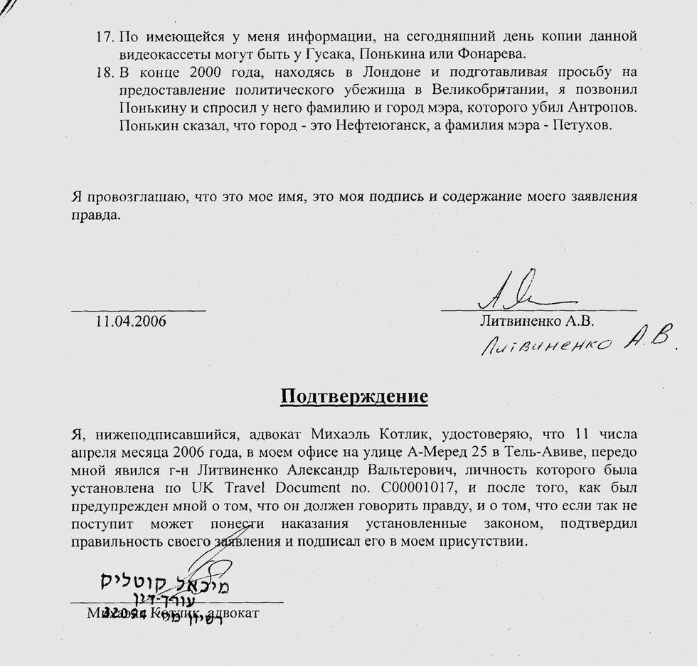 "Через своих подчиненных майора Андрея Понькина и майора Германа Щеглова, которых я ранее состыковал с Фонаревым (оперуполномоченный Управления уголовного розыска Московской области), я получил информацию о том, что в Московском областном Управлении уголовного розыска есть видеозапись Антропова, передающего сорок тысяч долларов наемному убийце за убийство мэра Нефтеюганска Петухова. Кроме меня данная информация поступила также к моему непосредственному начальнику – Гусаку", – говорится в показаниях Литвиненко.