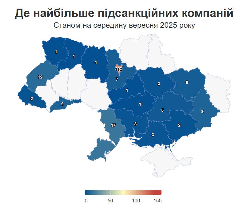 "Наибольшая концентрация санкционных компаний зафиксирована в Киеве – здесь зарегистрировано более половины фигурантов списка: 112 предприятий. Значительно меньше таких предприятий в регионах: в Одесской области – 17, во Львовской – 12, в Черновицкой и Донецкой областях – по девять", – сообщили в сервисе.