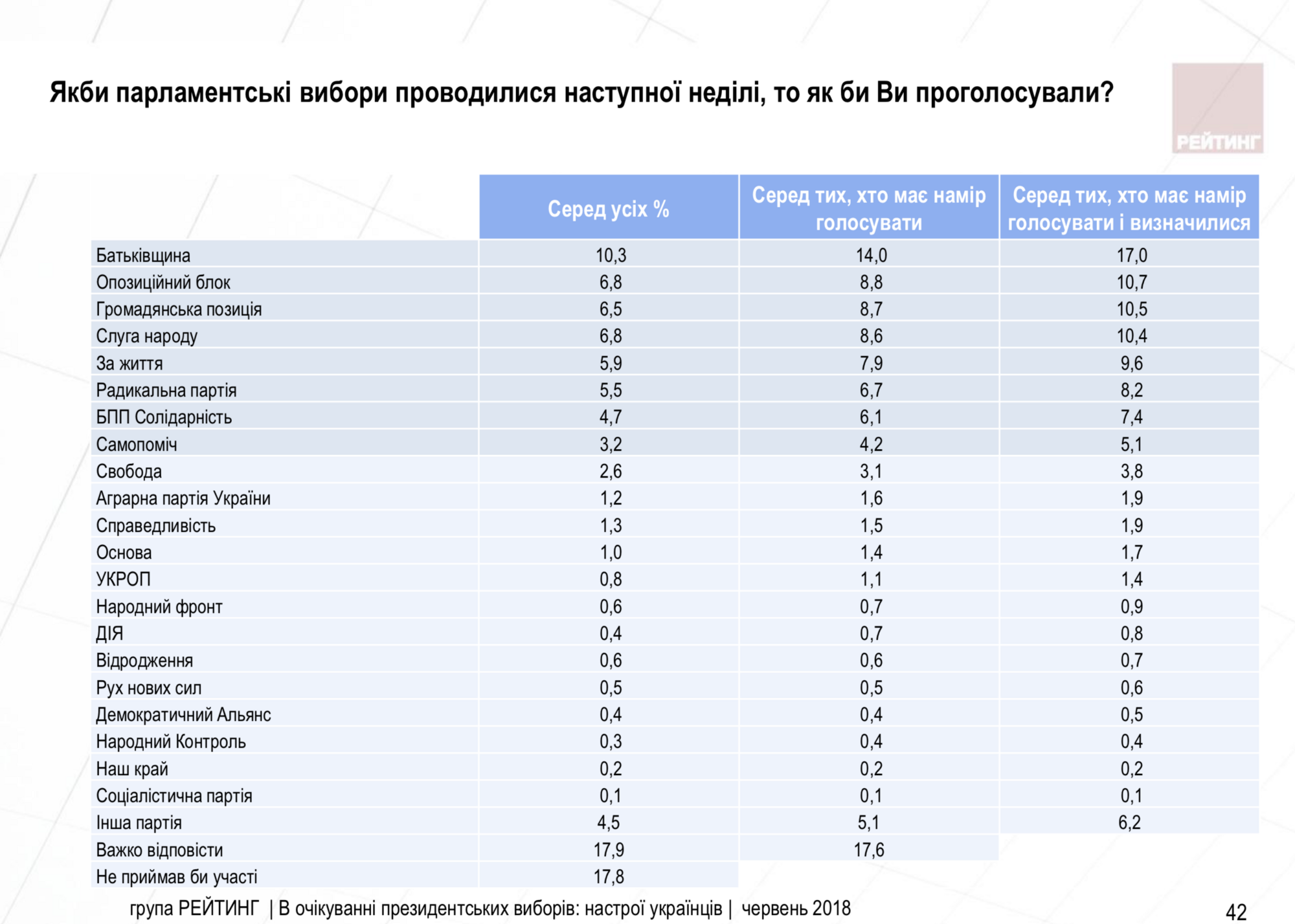 Если бы выборы в Верховную Раду проходили в ближайшее воскресенье, то первое место с 17% голосов получила бы партия "Батьківщина" Юлии Тимошенко. Такой результат среди всех, кто собирается пойти на избирательные участки, и уже решил, за кого голосовать, получила социологическая группа "Рейтинг". Опрос проводился с 14 по 24 июня этого года, обработанные данные компания опубликовала сегодня на своем сайте.