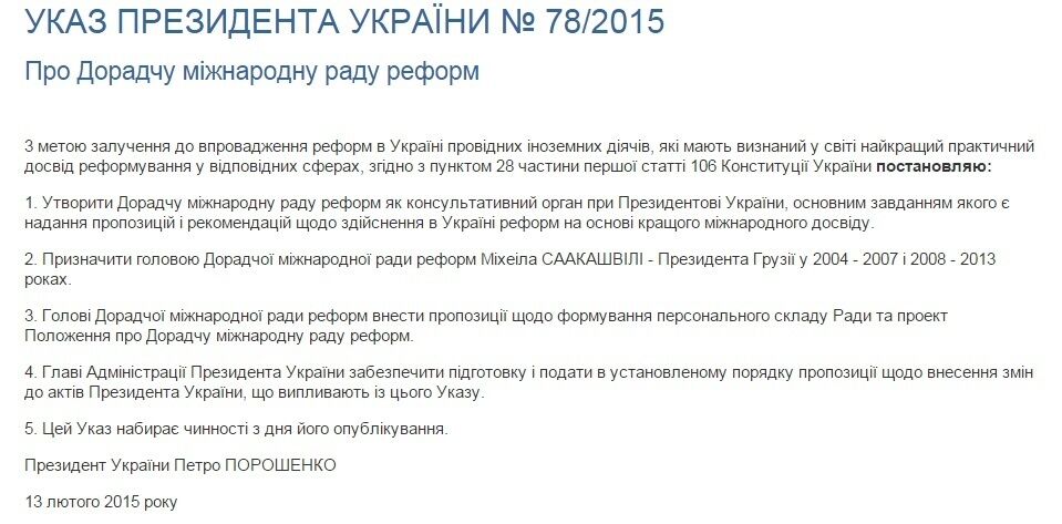 Президент Украины Петр Порошенко учредил Консультативный международный совет реформ, главой которого назначил экс-президента Грузии, своего советника Михаила Саакашвили. Соответствующий указ №78/2015 от 13 февраля опубликован на сайте главы государства.
