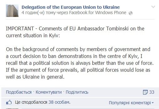 "Принимая во внимание комментарий члена правительства и решение суда о запрете демонстраций в центре Киева, я напоминаю, что политическое решение всегда лучше, чем применение силы. Если аргумент силы преобладает, проиграют все политические силы, так же, как и Украина в целом", – сказано в комментарии дипломата, размещенном на странице представительства ЕС в Facebook.