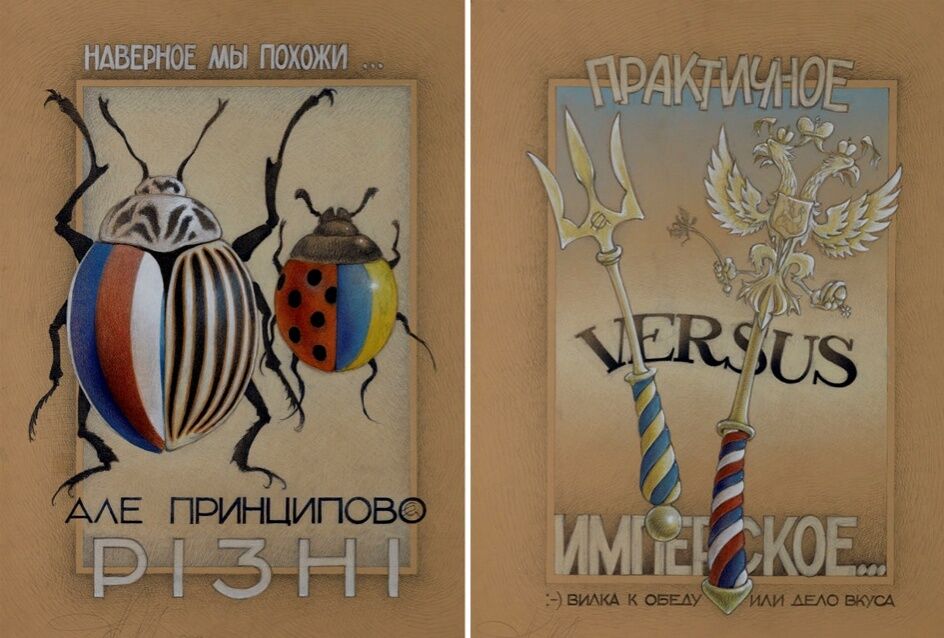 На его выставленных в "Мистецькому арсеналі" и собравших толпы зевак "веселых картинках" сине-желтая, раскрашенная в цвета украинского флага, безобидная божья коровка и здоровый полосатый российский колорадский жук красовались, вместо звезды на башне Кремля, как влитой, будто всегда только там и был, наш трезубец сидел, а другие такие же, словно снежинки, на головы кремлевских обитателей падали... Картина эта, кстати, "Снег в колонии" называлась и чуть ли не иллюстрацией к известному анекдоту стала: "Вы не знаете, почем в Москве пиво?". — "Як усюди, синку, по шість гривень".